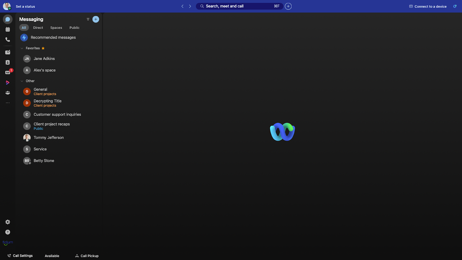 In the app header, click search, meet, and call to search through the history of your conversations to find people you're talking to, spaces you're in, messages you received, and files you need.