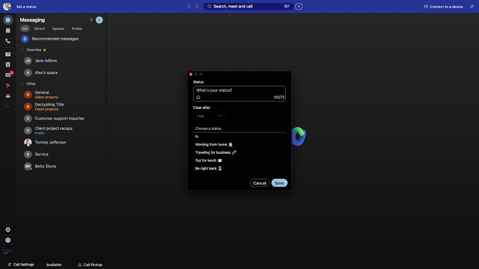 Create and post the status you want so that your colleagues know what you're up to. To set a custom status: