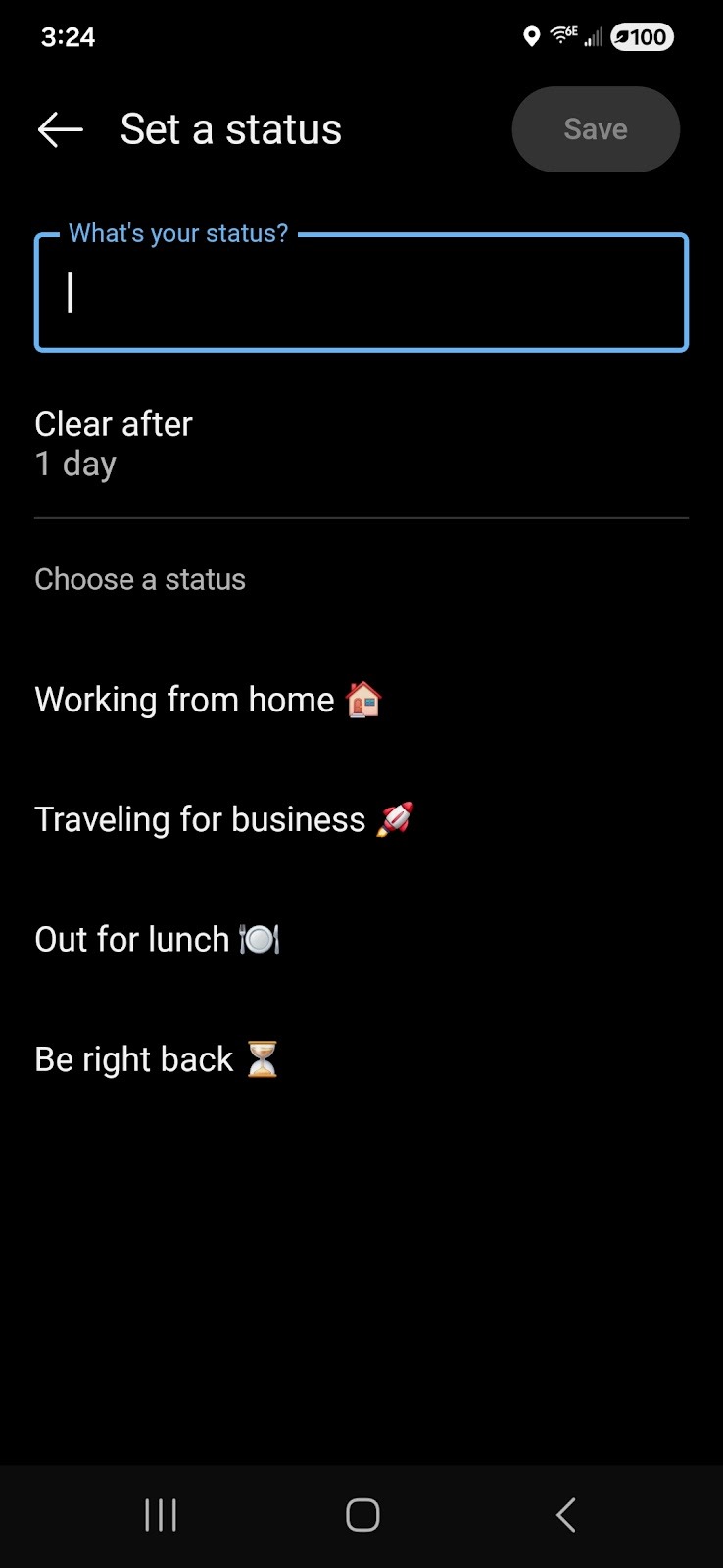 Note: You can add up to five status options to the list, so they are quickly available. Each status has a maximum length of 75 characters and can include emojis.