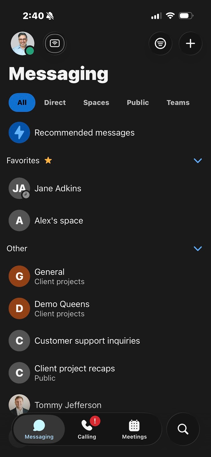 People and Spaces appear on the main screen after login. Tap the Messaging icon at any time to return to this screen. At the top, are your latest active spaces. If you've been added to a new team or space by anyone, you'll see it here too. You will see a bold space name when someone has posted a new message in space.