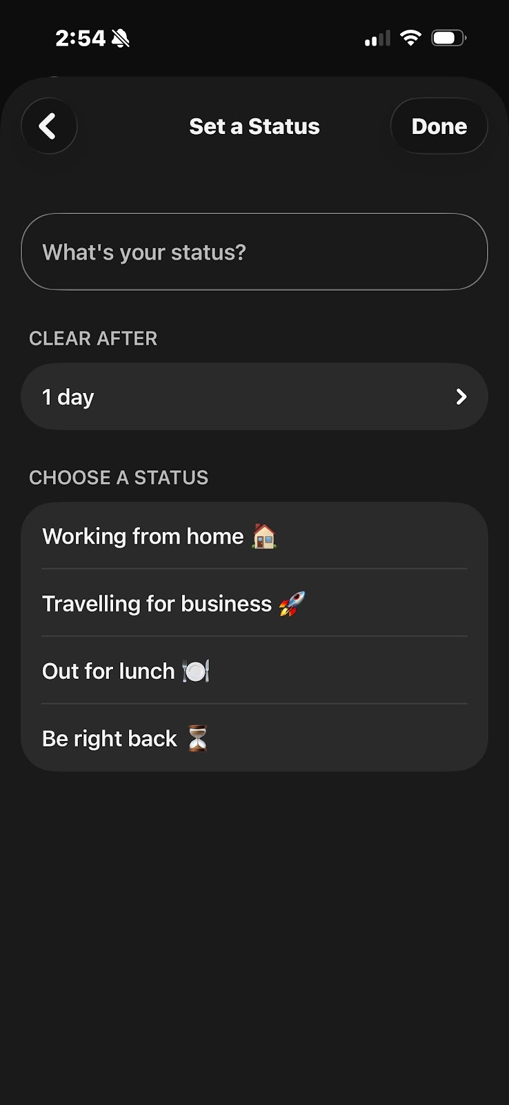 Note: You can add up to five status options to the list, so they are quickly available. Each status has a maximum length of 75 characters and can include emojis.