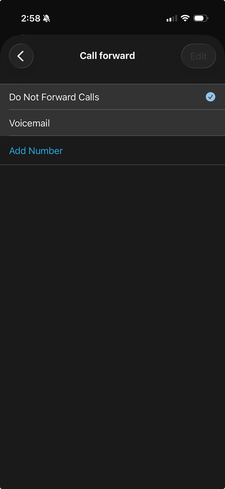 • 4. Tap Add Number to add a phone number to forward calls to. Once added, you can then choose to forward calls to that number from the drop-down menu. To remove a phone number from your call forward list, select the Edit icon. Select the number to remove then tap Delete
