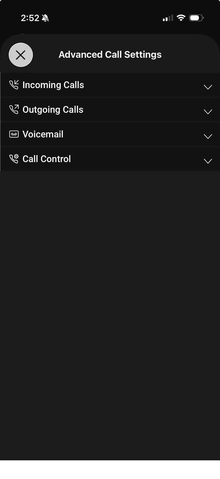 Tap Advanced Call Settings. A window opens with call settings in these different fields: Incoming Calls, Outgoing Calls.