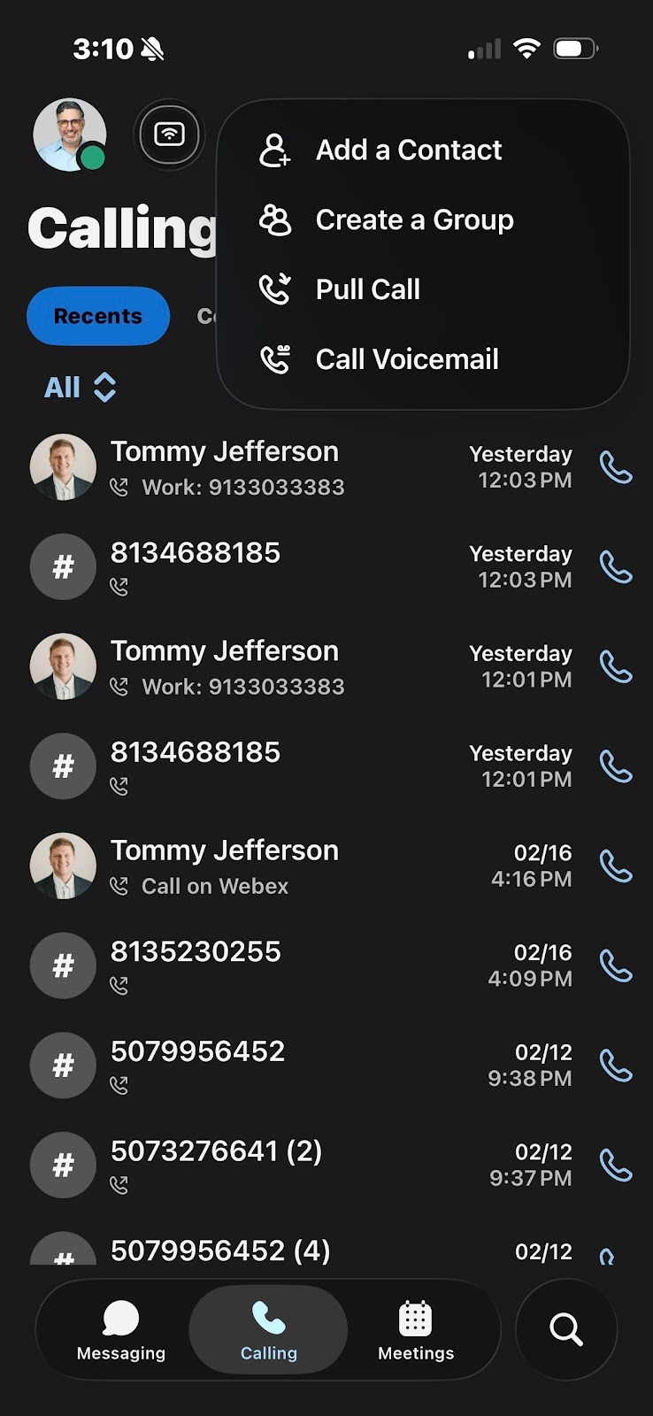 3. Tap the Plus icon and select Pull Call. The call is now moved from your desk phone to your Webex Mobile app.